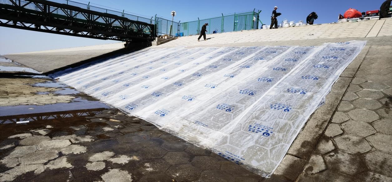 混凝土節(jié)水保濕養(yǎng)護膜,是以新型可控高分子吸水材料為核心,以塑料薄膜為載體,通過設(shè)備加工復合而成的卷材產(chǎn)品。其中高分子材料可吸收自重200倍的水分子, 吸水膨脹后變成透明的晶狀體,把液態(tài)水變成固態(tài)水,每平方米養(yǎng)護膜可蓄水0.5KG,成為一個固態(tài)的微型水庫,然后通過毛細管的作用向混凝土養(yǎng)護面滲透, 同時不斷吸收混凝土在水化過程中產(chǎn)生的蒸發(fā)水,因此在一個養(yǎng)護期內(nèi)總能保持混凝土表面濕潤。